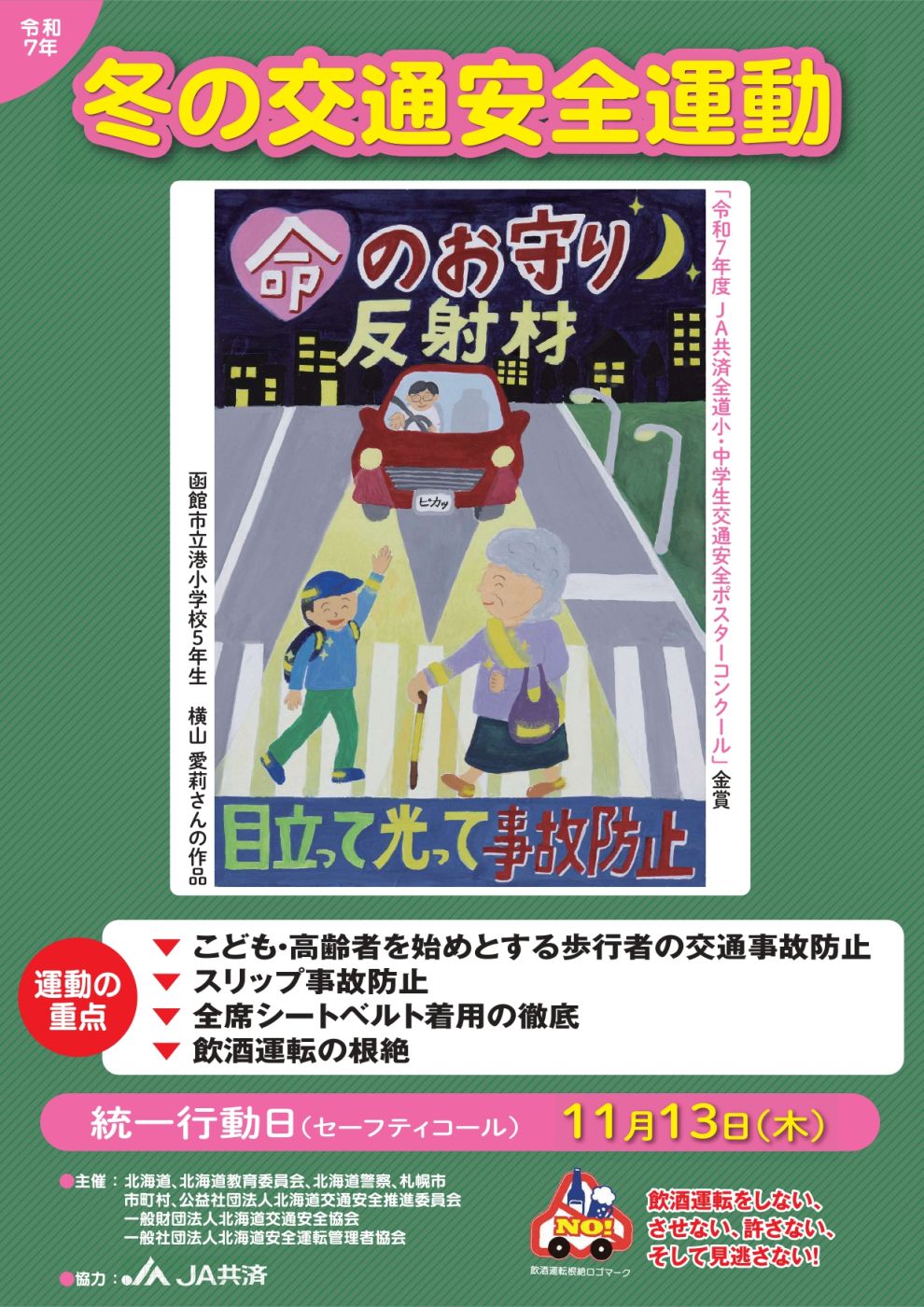 令和7年冬の交通安全運動に参加中 本日11月13日から11月22日迄の期間「令和7年冬の交通安全運動」が始まりました。 1人1人の心掛けで交通事故・飲酒運手「ゼロ」を目指しましょう!! 記事一覧に戻る 次の記事